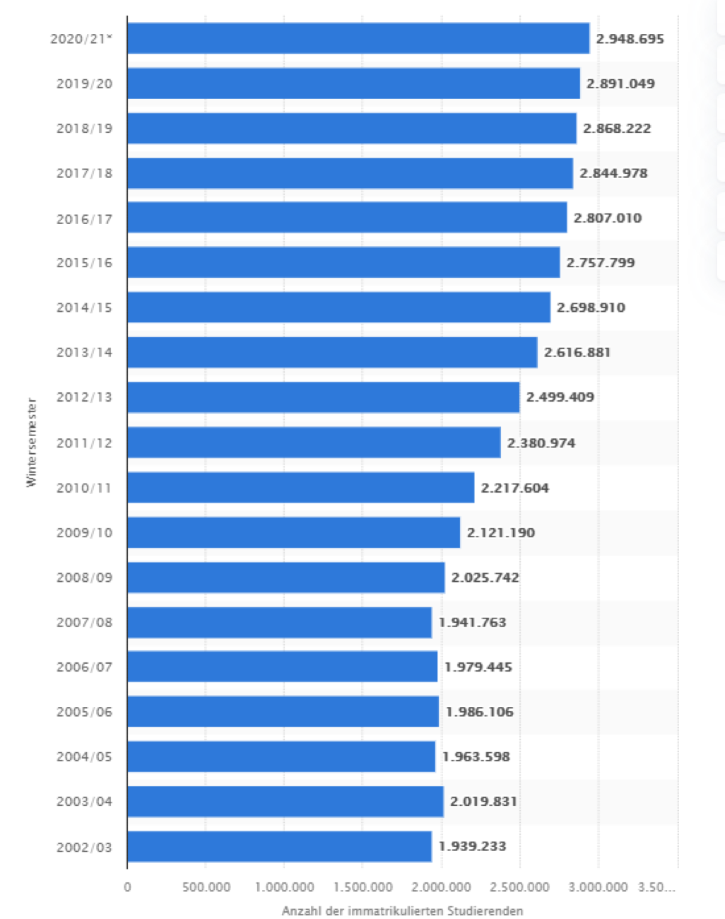 自20世纪50年代起,西德开始实行教育扩张,目的在于加强国民的受教育程度,同时适应国际社会技术和科学的推进。自此以后,接受学术教育的年轻人数量便逐年递增。1952年,全德仅有13%的中学生上的是以学术教育为主的文理学校,其余中学生都是在以职业教育为主的实科中学/职业预科接受职业培训,并在毕业以后进入企业,担任学徒工。但到了2019年,接受学术教育的中学生比例已经达到了40%。