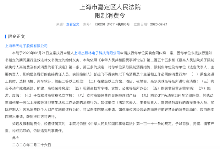 该案中,奉天电子不同意杰慕林要求其支付货款占用利息损失金额,因为杰慕林未足额开具发票,支付条件未成就,据此请求法院驳回杰慕林的诉请。此外,申报稿还显示,因单位未按执行通知执行买卖纠纷案,奉天电子及其实控人之一彭雄飞也于2020年被采取限制消费措施。该案具体情况如何,仍待奉天电子解释。