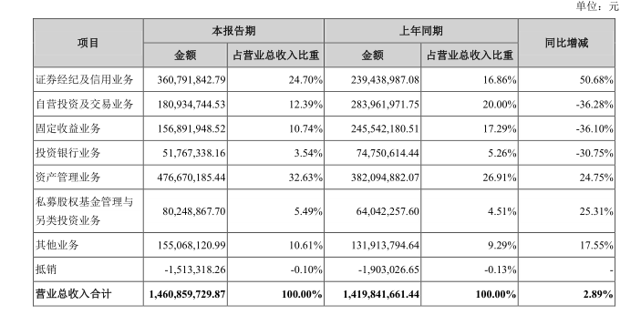 其中,资管业务营收4.77亿元,同比增长24.75%,占总营收的比重为32.63%,较去年同比有所提升;证券经纪及信用业务营收3.61亿元,同比增长50.68%,占总营收比重为24.70%。