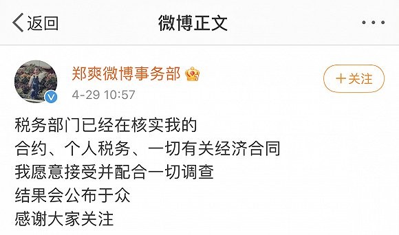 4月29日上午,郑爽在其工作室微博@郑爽微博事务部表示,“税务部门已经在核实我的合约、个人税务、一切有关经济合同,我愿意接受并配合一切调查。结果会公布于众,感谢大家关注。”