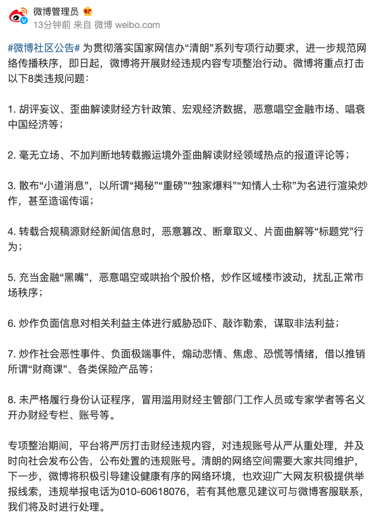 8月28日,@微博管理员 宣布,为贯彻落实国家网信办“清朗”系列专项行动要求,进一步规范网络传播秩序,即日起,微博将开展财经违规内容专项整治行动。微博将重点打击以下8类违规问题: