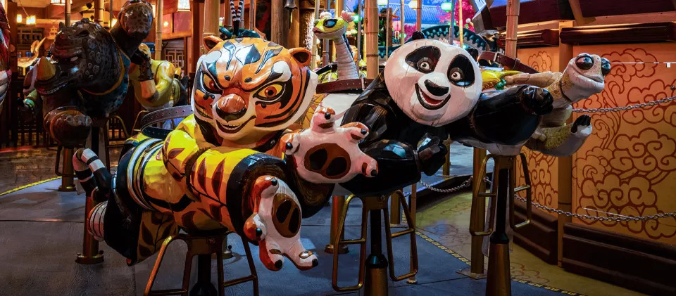 这是全球首个以“功夫熊猫”为主题的景区,也是整个度假区里中国味儿最浓的景区。景区取材于梦工厂系列动画影片《功夫熊猫》,围绕“中国式传奇体验”进行设计,打造全室内景点。在“灯影传奇”“和平山谷”“熊猫村”景点,游客将和主人公阿宝一起,穿越电影银幕,体会别样“中国风”。