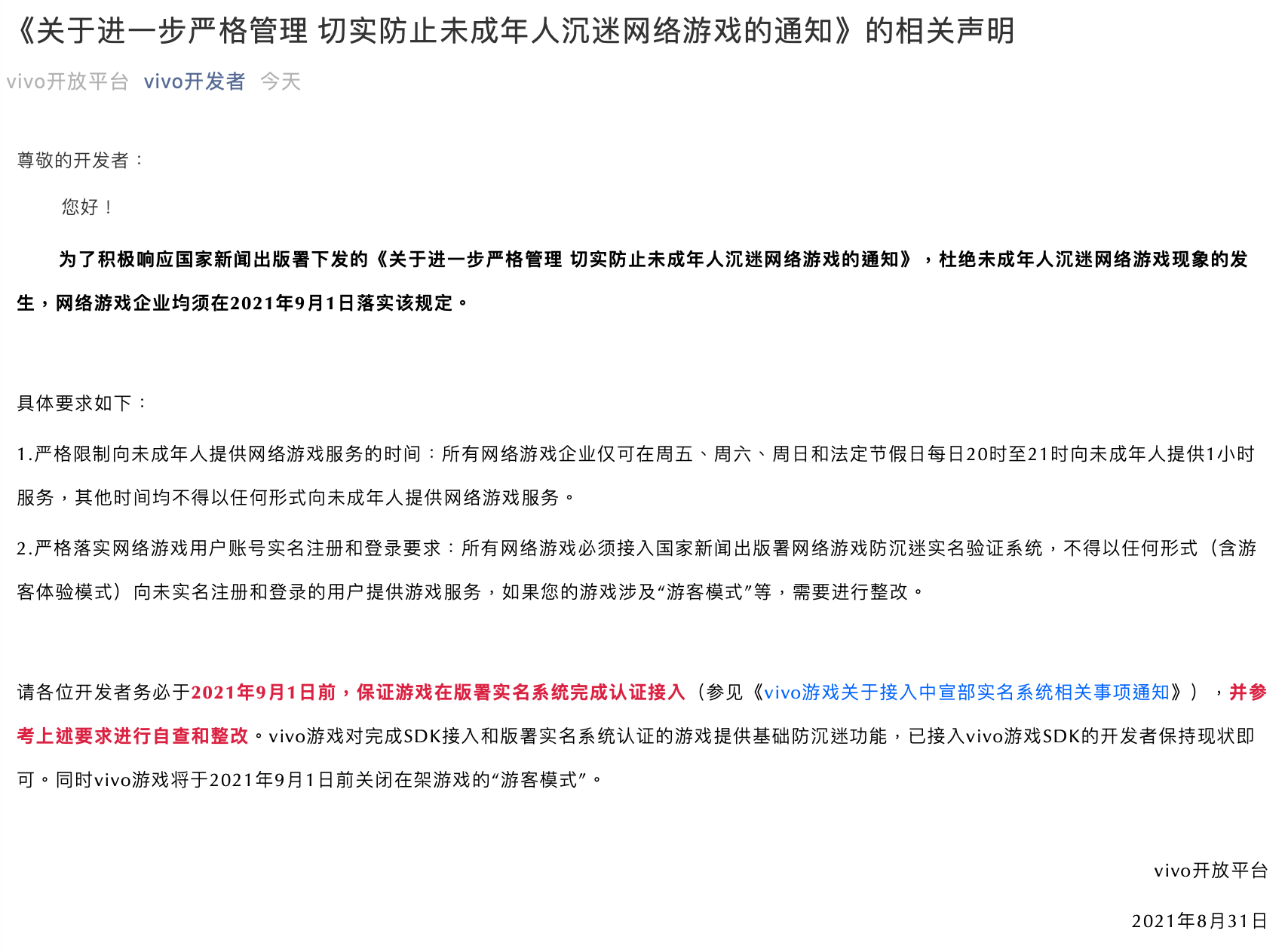 8月31日,vivo开放平台发布《关于进一步严格管理 切实防止未成年人沉迷网络游戏的通知》的相关声明称,为了积极响应国家新闻出版署下发的《关于进一步严格管理 切实防止未成年人沉迷网络游戏的通知》,杜绝未成年人沉迷网络游戏现象的发生,各位开发者务必于2021年9月1日前,保证游戏在版署实名系统完成认证接入,并进行自查和整改。vivo游戏对完成SDK接入和版署实名系统认证的游戏提供基础防沉迷功能,已接入vivo游戏SDK的开发者保持现状即可。同时vivo游戏将于2021年9月1日前关闭在架游戏的“游客模式”。