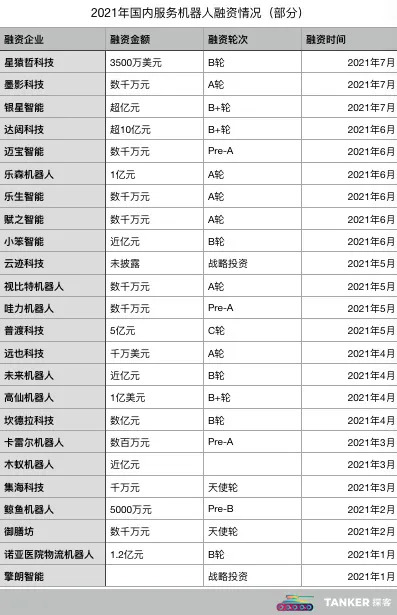 据「探客Tanker」不完全统计,今年1月到7月,已有20多家服务机器人企业拿到融资,其中拿到过亿融资的有近一半,这一数字已经超过了2020年全年。