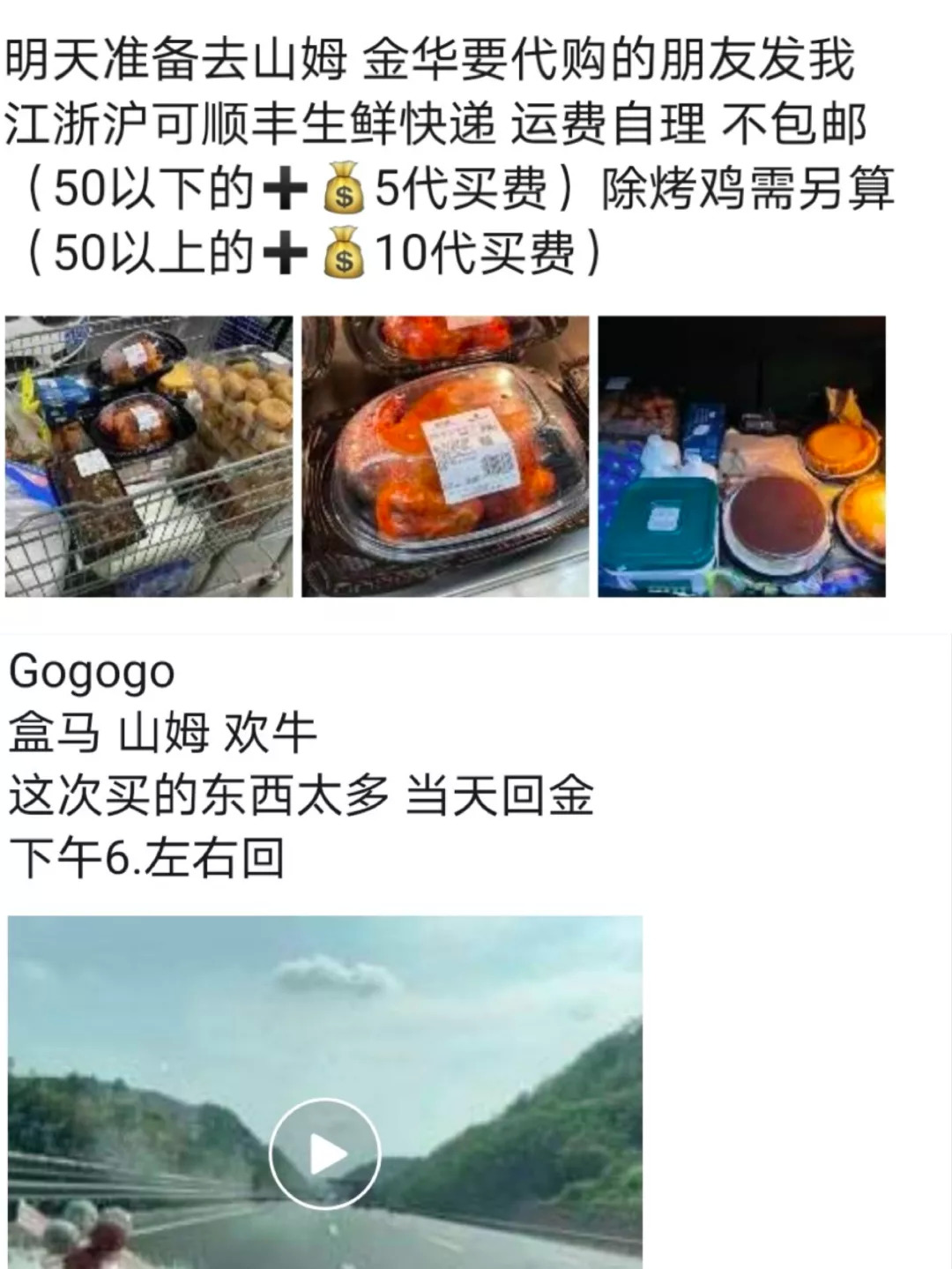 从乔美的朋友圈可以看到,家住浙江金华的她,会利用周末的时间开车前往杭州的山姆、盒马会员店进行采购,“50元以下的每单收5元代买费,50元以上的每单收10元代买费”,邮费自理。