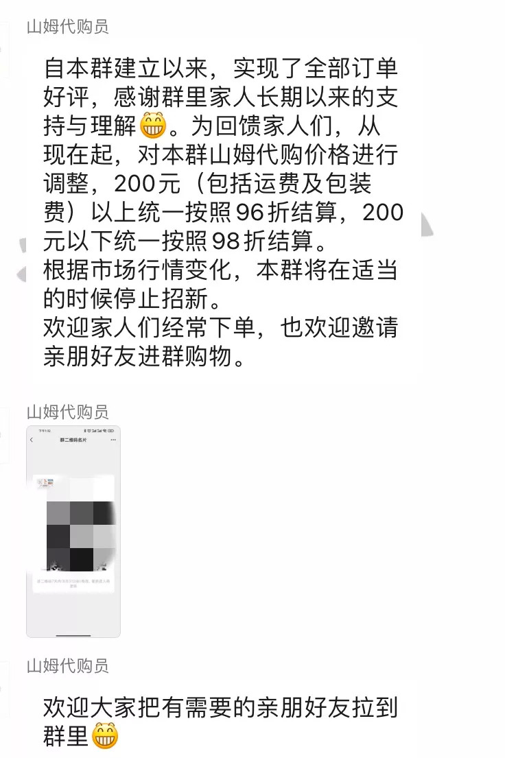 和李洁、唐茶这种个人代购不一样,在江苏连云港代拍陈晨的背后,似乎有一条更长的利益链条。据Tech星球了解,陈晨是闲鱼上一个免费山姆代拍的接单客服,也是赚积分的。在陈晨所在的200人代购群里,有三个接单客服,和一个老板。上个周末,陈晨接了十几单100元以上的订购单,但有时也会闲得无聊。