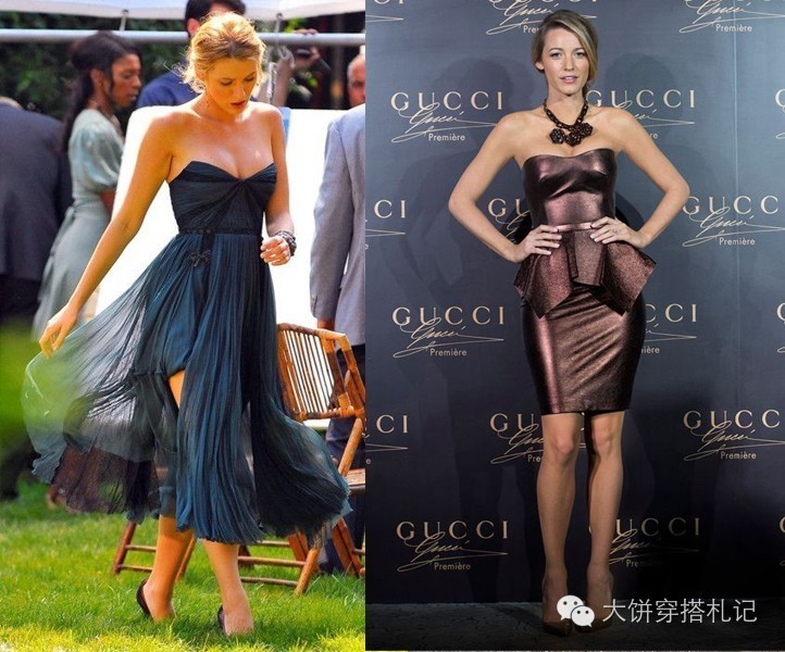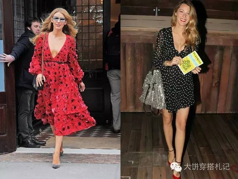 大概觉得不费脑,也不容易出错,Blake日常生活偏爱One piece的连衣裙。胸部丰满的她尤其喜欢深V领的高腰X型连衣裙~↓