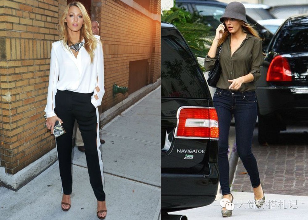 因为腿型好,Blake偏爱各种凸显美腿的铅笔裤,用略微宽松的衬衫随意的打结露出腰,搭配铅笔裤就是她常见的日常穿法之一。
