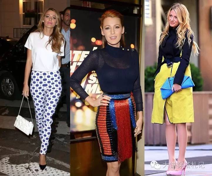 讲真,Blake最迷人一定当属她的笑了吧,所以玩色才最适合这类阳光女生。饼觉得穿彩色的她更阳光迷人,并且减龄。But,玩撞色或印花搭配时,坚持一身大面积不超过三色,以及色彩呼应。↓