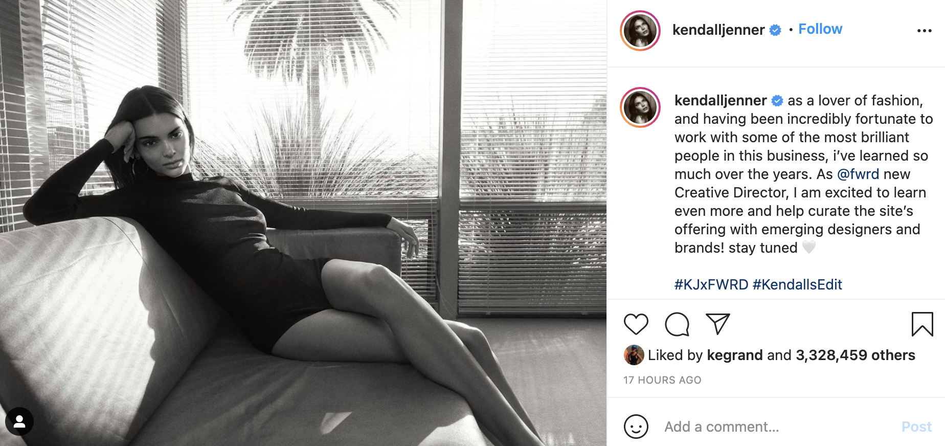 尽管Kendall Jenner没有接受过正式商学院教育的背景让这份任命产生了一定的争议,但从营销的角度来看,借助Kendall Jenner在社交媒体上的热度,FWRD也能在一定时间内获得大量的热度和流量。