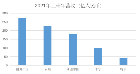 据安踏2021年中期报告显示,其上半年实现营收228.1亿元,超过阿迪中国的182.98亿元,与第一名耐克中国的273.4亿元的差距也并非鸿沟。