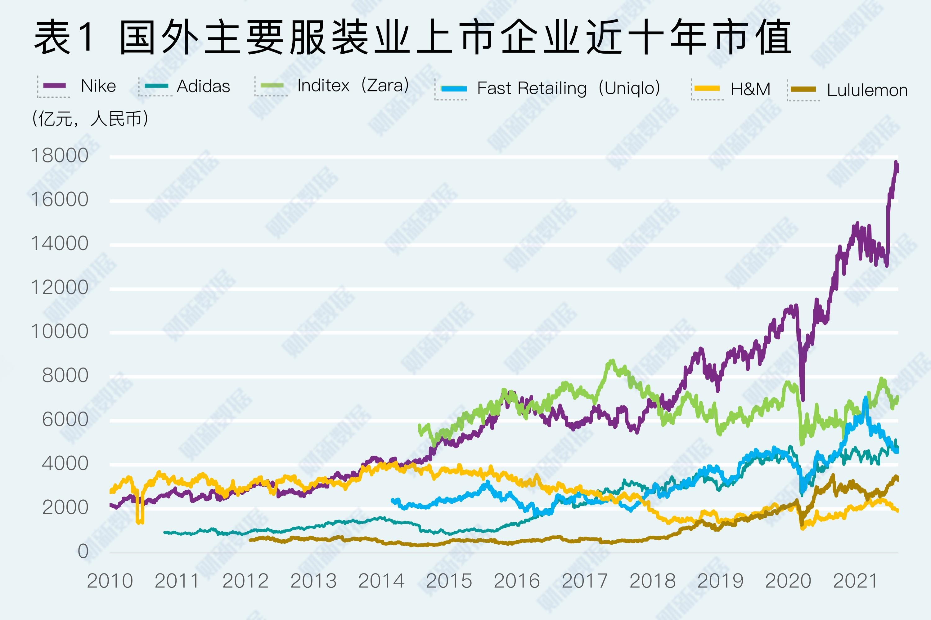 从下图全球主要服装上市企业近十年市值可以看出,2017年到2018年期间,耐克就开始走出了陡峭的曲线,远超其他服饰品牌。与此同时,ZARA、HM等快时尚品牌增长放缓。快时尚品牌中,只有优衣库母公司保持上升趋势,但体量和耐克也相去甚远。
