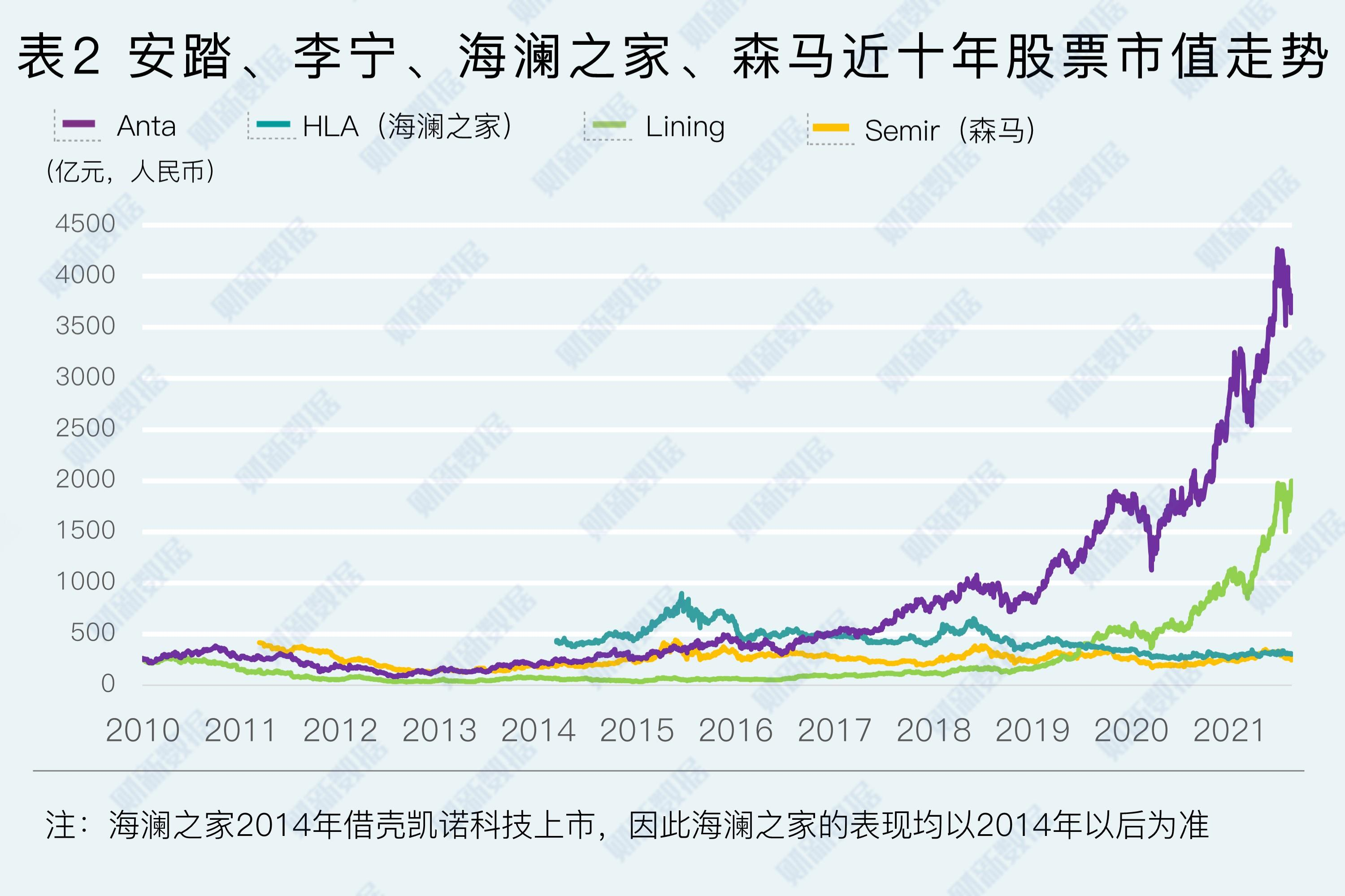 在更早的2014年到2016年期间,休闲品牌海澜之家是中国市值最高的服装企业。彼时的海澜之家一度喊出要做市值千亿服装企业的口号。不过海澜之家的“千亿梦“并没有实现。真正做出了“千亿梦”的,还是安踏和李宁两家运动服饰企业。