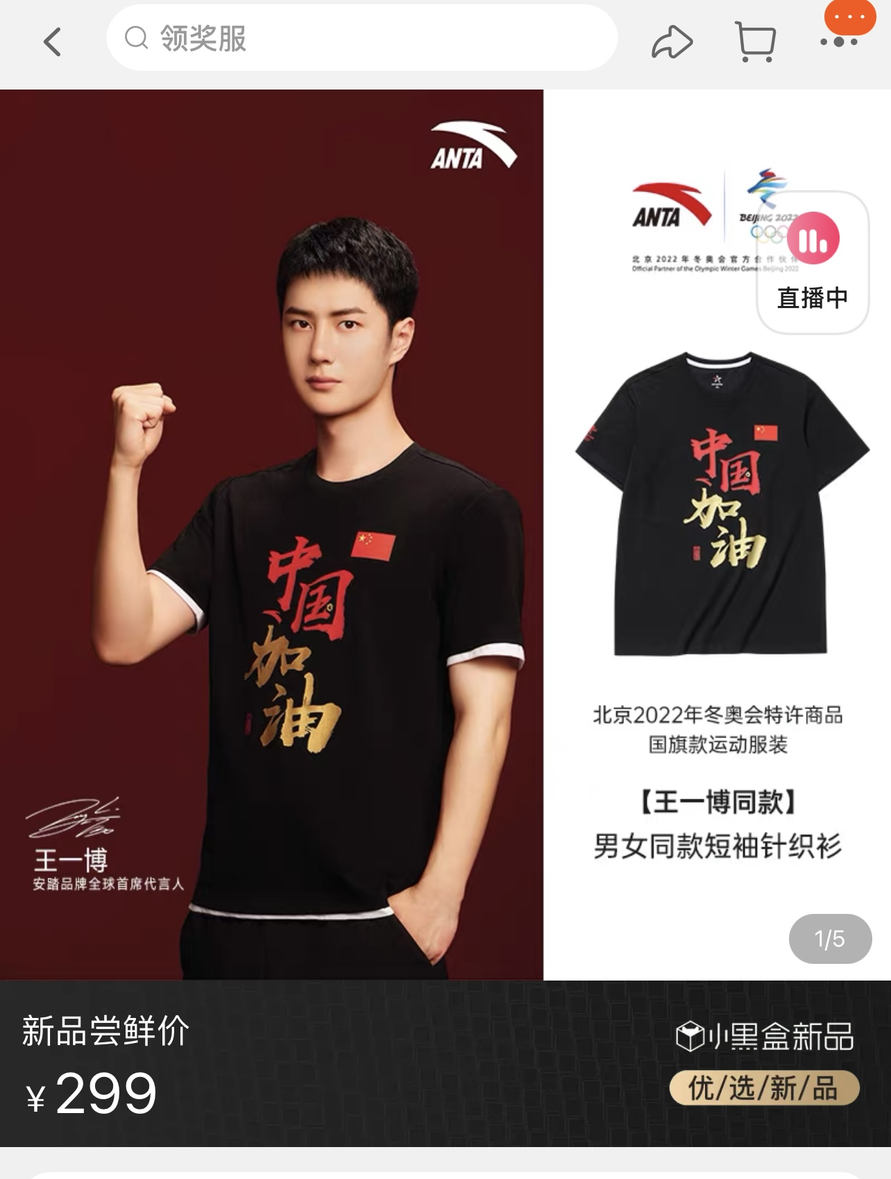 比如安踏在2020年配合北京冬奥会推出的国旗联名款,就颇有些向李宁做国潮看齐的趋势,但从官网查询,一件国旗款T恤定价299元,远高于安踏品牌百元以内价格区间,价格直指耐克的T恤价格。