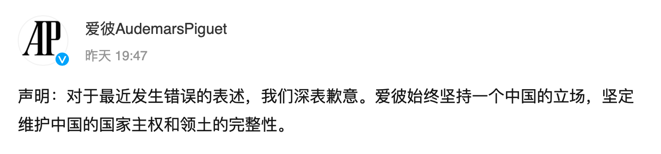 据环球网报道,此前,有微博网友爆料,瑞士名表爱彼的总裁在接受采访时声称台湾为“国家”。9月4日晚间,@爱彼AudemarsPiguet 发布声明称,对于最近发生错误的表述,深表歉意。爱彼始终坚持一个中国的立场,坚定维护中国的国家主权和领土的完整性。