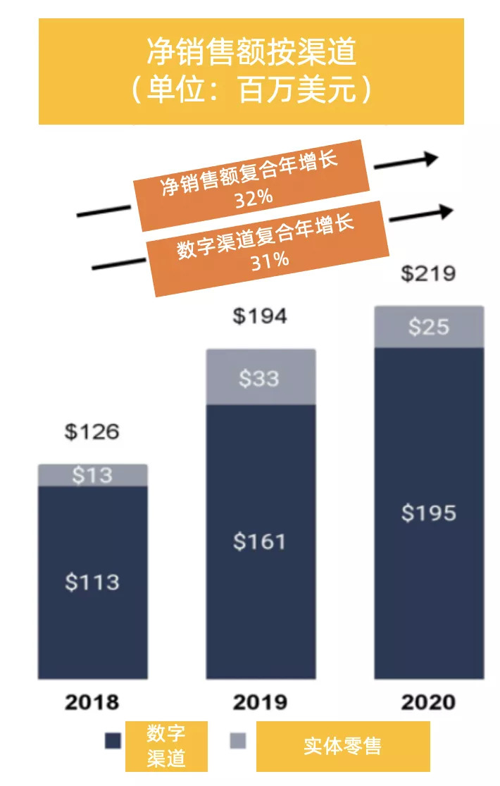 2019年比2018年的净销售额大幅增长了 54%,其中,数字渠道增长42%;实体零售门店从2018年的3家扩张至14家,推动实体零售渠道净销售额同比大增157%。