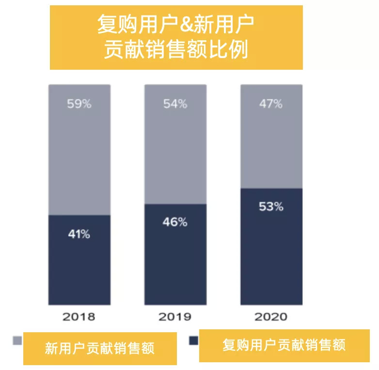Allbirds销售额的持续增长还受益于不断增强的客户粘性。2020年,Allbirds 品牌复购订单销售额占比从2018年的41%增加至53%。