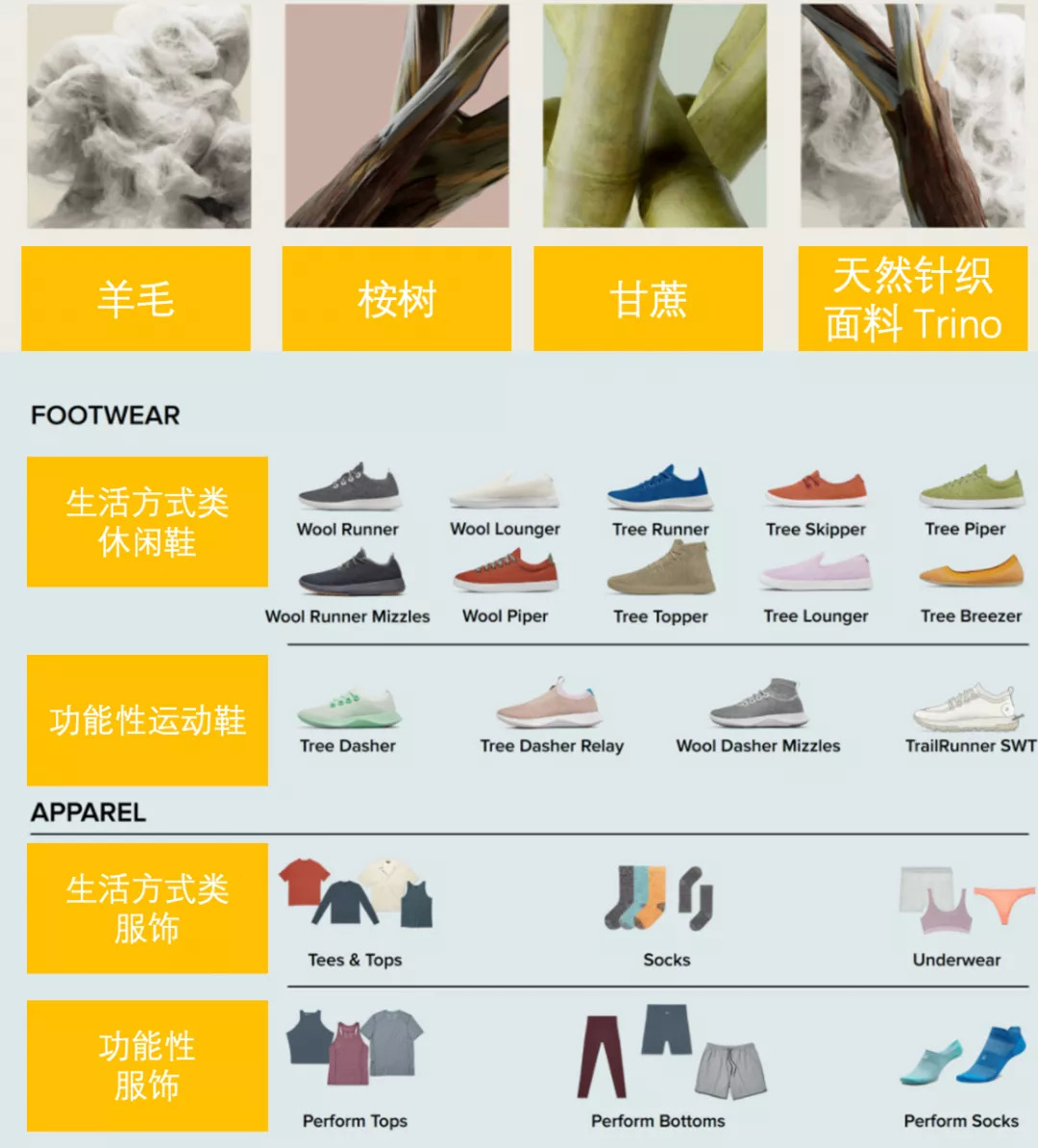 目前 Allbirds 产品已覆盖休闲鞋、运动鞋、袜子、内衣、外套等,主要可分为生活方式和功能性产品两大系列。