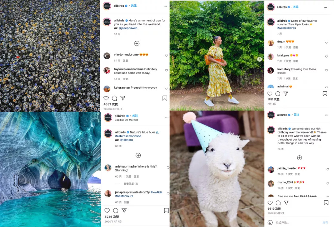 作为 DTC 品牌,Instgram,Facebook 等主流社交媒体平台上自然也是 Allbirds与用户间的重要互动场所。浏览Allbirds 的社交媒体内容,会发现除了产品推介外,很多配图都是花花草草、小动物或是自然风光。Allbirds以这样可爱清新的风格避开了说教式的科普宣传,形成一种良性的互动式传播。