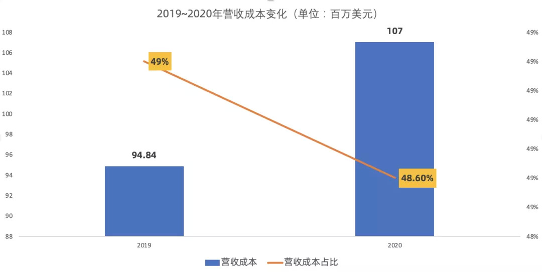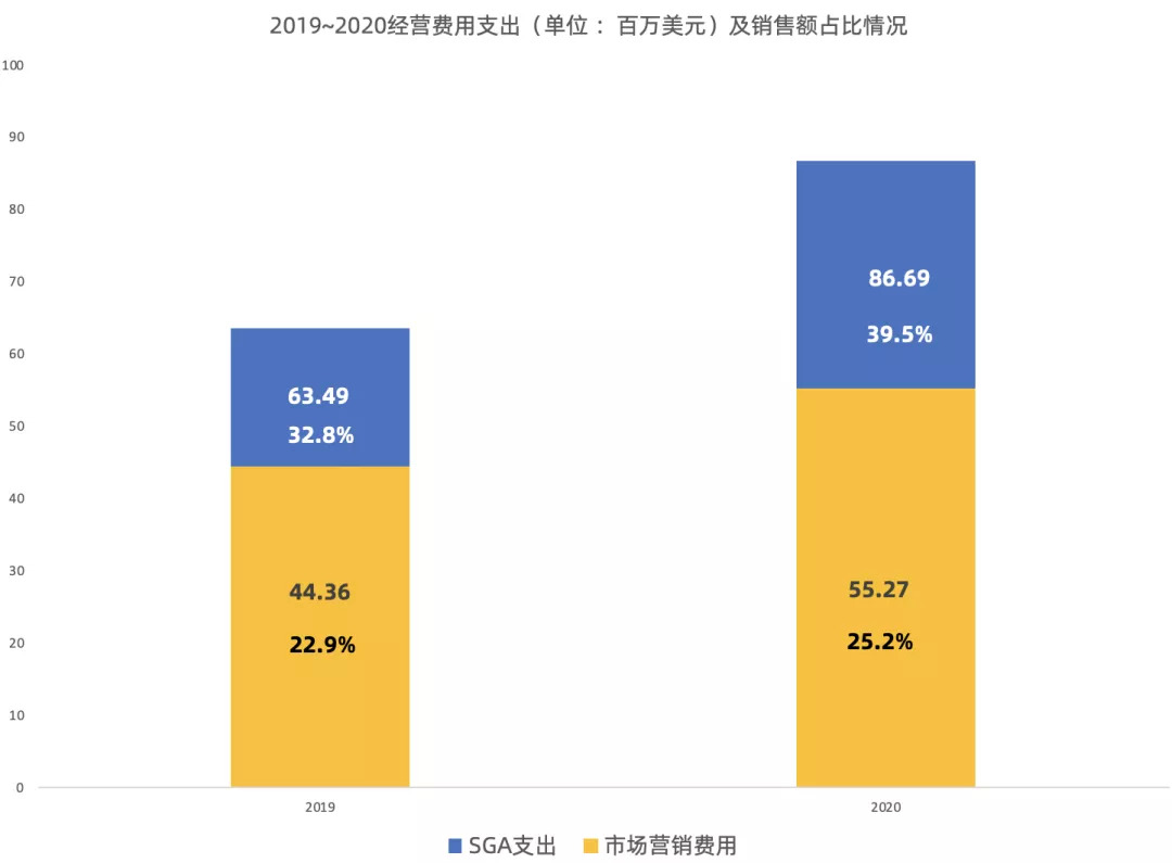 此外,由于疫情导致的制造和运输等成本的增加,Allbirds 2020年的营收成本(Cost of revenue)相较2019年也增加了2560万美元。但得益于有利的产品结构和产品利润率提升,2020年营收成本占销售额的比重相较2019年略有下降,因此也维持了利润率的持续增长。