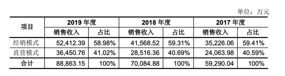 在营收方面,2017年-2019年,千味央厨营收分别为5.93亿元、7.01亿元、8.89亿元,净利润分别为4655.91万元、5867.89万元、7412.13万元。其中经销模式和直营模式的占比如下图: