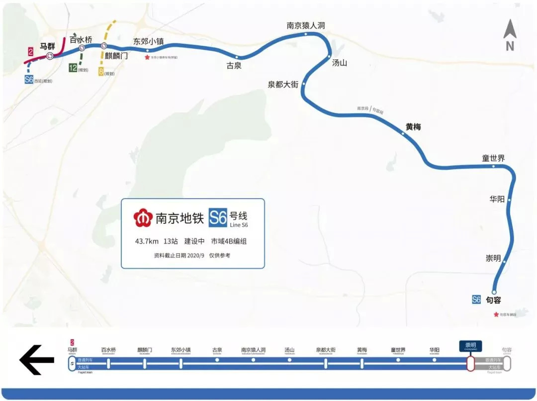 S6号线南京段从马群站到泉都大街站,线路长26.31公里,设站8座,地上高架三站分别为东郊小镇站、古泉站、南京猿人洞站;地下五站分别为马群站、百水桥站、麒麟门站、汤山站、泉都大街站。
