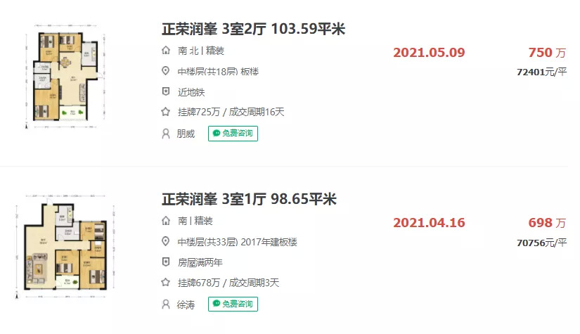 距离青莲街站最近的楼盘是正荣润峯,目前小区挂牌均价68938元/㎡,最近两次成交分别为4月一次、5月一次,成交均价破7.2万/㎡。