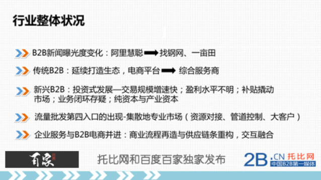 根据B2B专业网站托比网2015年10月发布的《中国B2B电商行业的宏观分析报告》,2014年中国B2B市场的热门词汇是阿里、慧聪产业信息和上市财报,2015年则被找钢网、化塑汇、一亩田此类创业B2B公司占据头条。