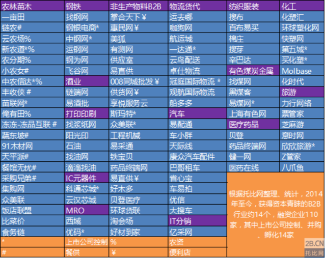 去年,中国约有14家创业B2B企业由上市公司孵化、投资或并购。“传统B2B企业在通过资本运作补足交易形态的缺失。”托比网报告指出。