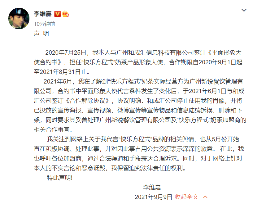 9月9日,李维嘉在个人微博发布个人声明,对代言产品“快乐方程式”奶茶产生的纠纷进行了回应。李维嘉称,2020年7月25日,与广州和成汇信息科技有限公司签订《平面形象大使合约书》,担任“快乐方程式”奶茶产品形象大使,合作期限自2020年9月1日起至2021年8月31日止。