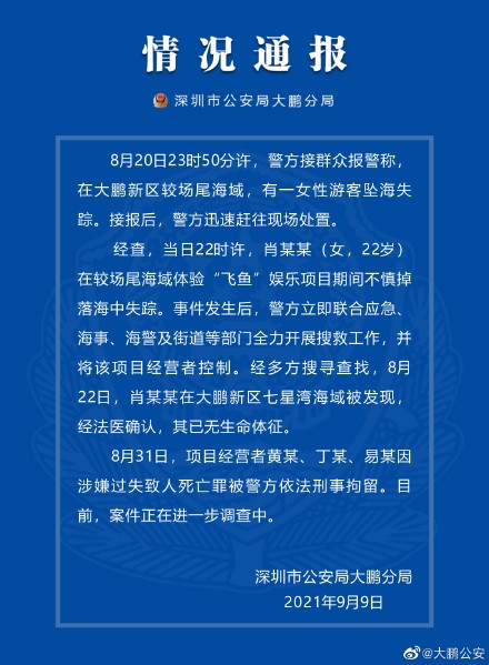 经查,当日22时许,肖某某在较场尾海域体验“飞鱼”娱乐项目期间不慎掉落海中失踪。事件发生后,警方立即联合应急海事、海警及街道等部门全力开展搜救工作,并将该项目经营者控制。经多方搜寻查找,8月22日,肖某某在大鹏新区七星湾海域被发现,经法医确认,其已无生命体征。