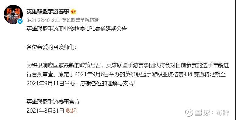 竞争如此白热化,眼看要熬出头了,最先等来却不是蛋糕而是大棒。恰逢新规发布,行业又是一波大洗牌。原定于9月6日就将开赛的英雄联盟手游职业资格赛·LPL赛道,在8月31日突然接到通知:未成年人不能上场了。于是,官方只能延期开赛,给俱乐部们更多调整的时间。