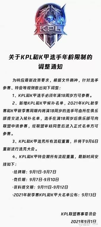 而在新规发布后不久,包括王者荣耀、英雄联盟、和平精英等头部电竞赛事的主办方第一时间配合政策发布了通知:将对参赛选手年龄进行合规审查工作,要求选手需满18周岁才能参加比赛。此前,KPL的最低年龄限制是16岁,而LPL则是17岁。