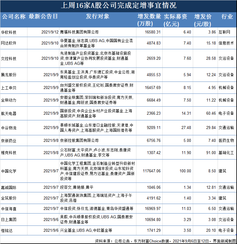该周,中国化学(601117.SH)、中谷物流(603565.SH)、航天电器(002025.SZ)、雅克科技(002409.SZ)、中信海直(000099.SZ)等16家上市公司完成定增事宜,实际募资累计约为222.24亿元。