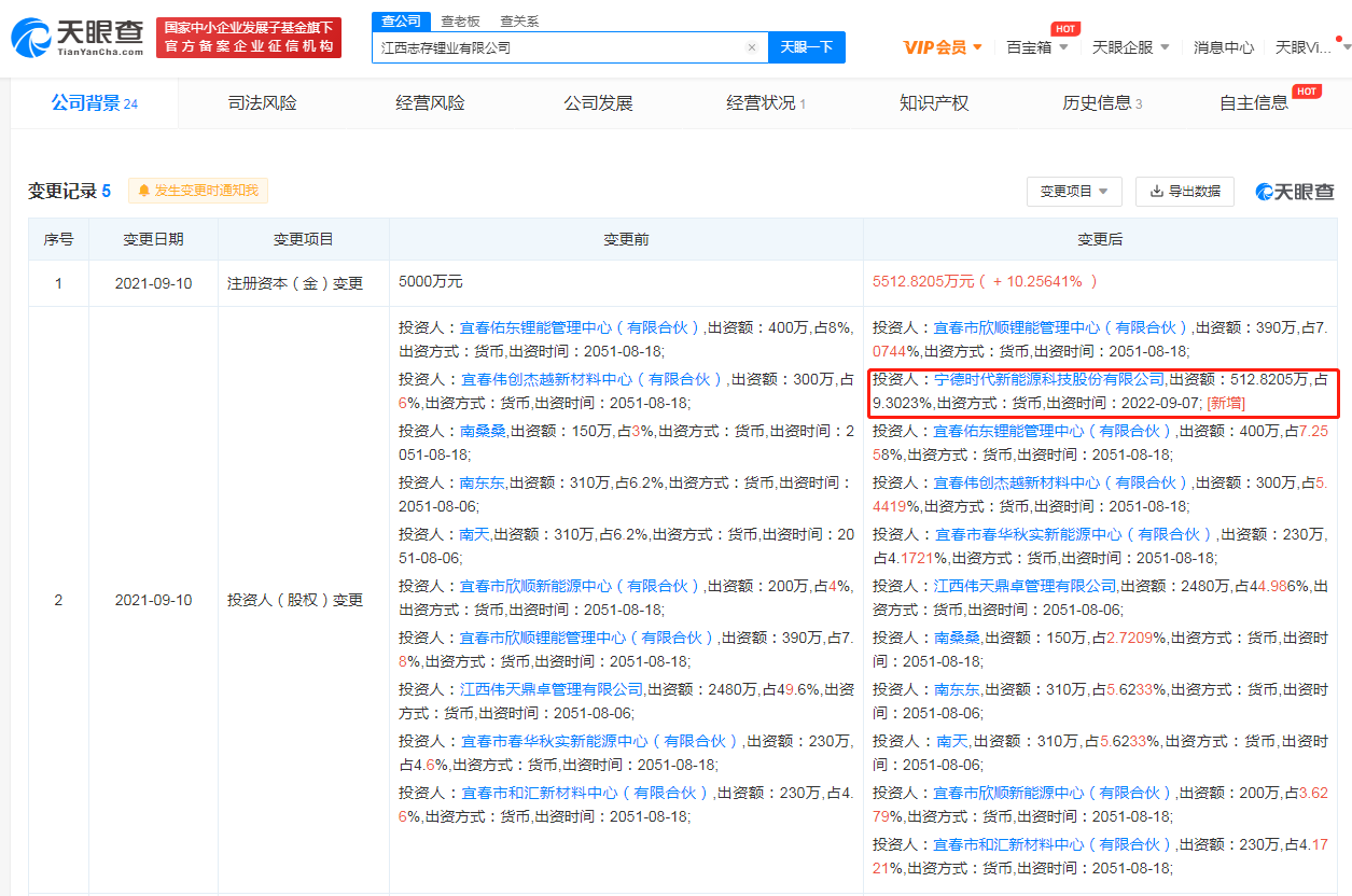 据天眼查APP显示,近日,江西志存锂业有限公司发生工商变更,新增股东宁德时代新能源科技股份有限公司,同时公司注册资本由5000万人民币增至约5512.82万人民币,增幅约10.26%。