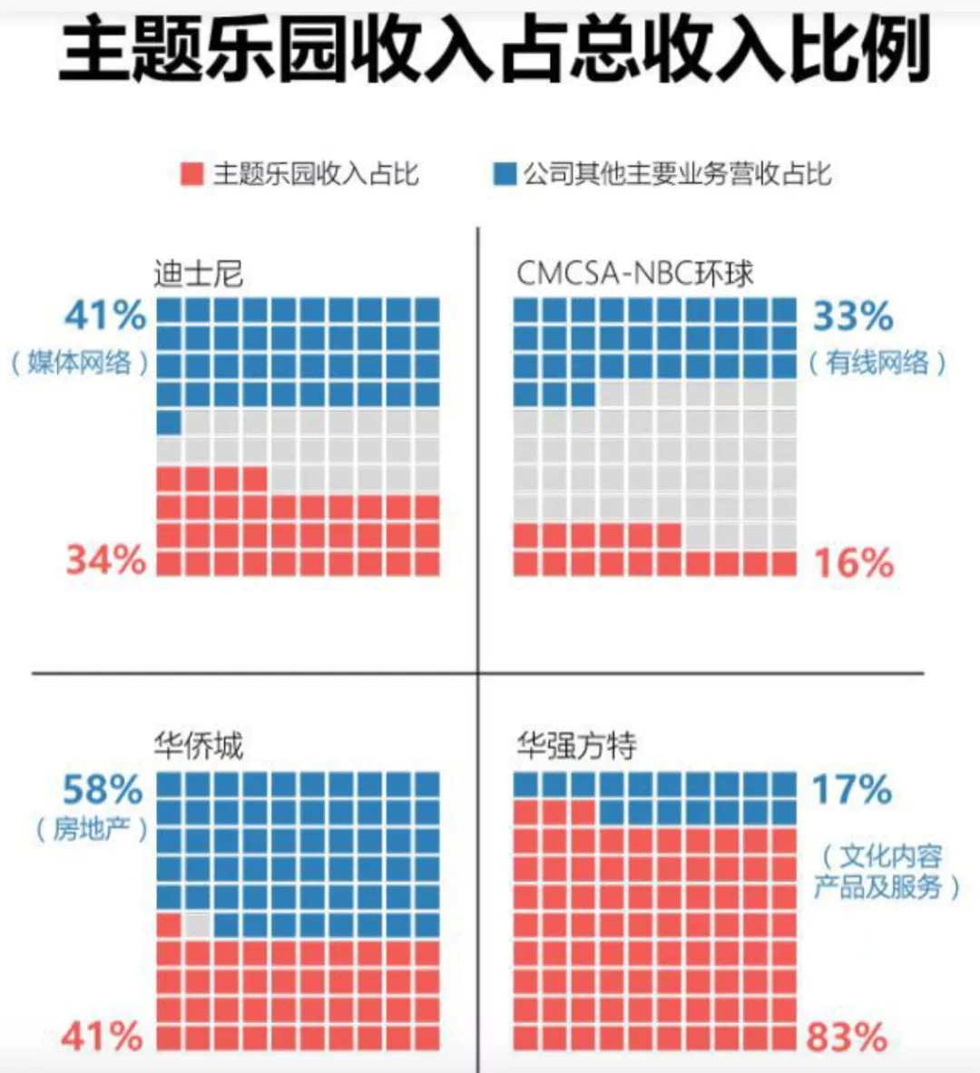 另外,迪士尼的主题乐园收入,也即主业收入只占到总收入的34%,环球影城更是只有16%。