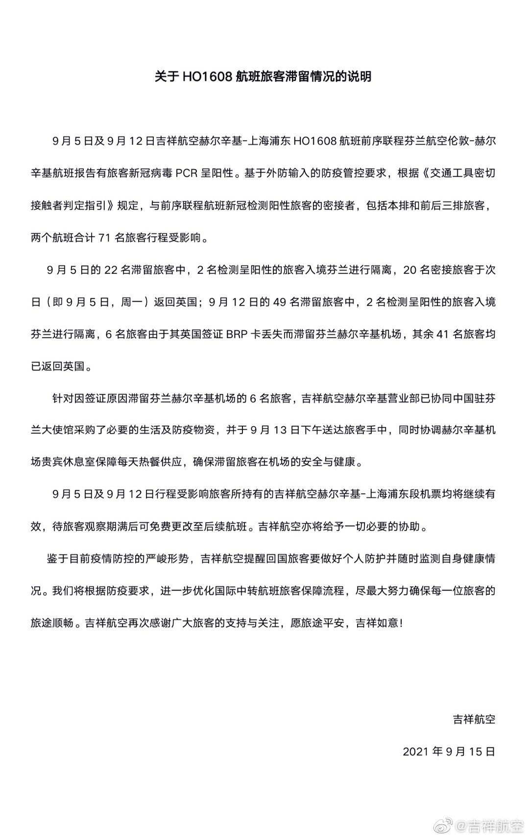 9月15日,@吉祥航空 发布《关于HO1608航班旅客滞留情况的说明》。9月5日及9月12日吉祥航空赫尔辛基-上海浦东HO1608航班前序联程芬兰航空伦敦-赫尔辛基航班报告有旅客新冠病毒PCR呈阳性。两个航班合计71名旅客行程受影响。