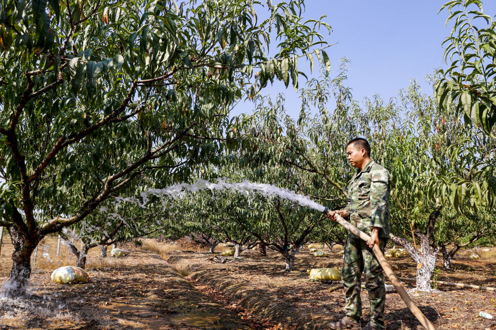 9月11日,江西省吉安市峡江县金坪民族乡新民民族村村民郑馨贵在给桃树浇水。陈福平摄