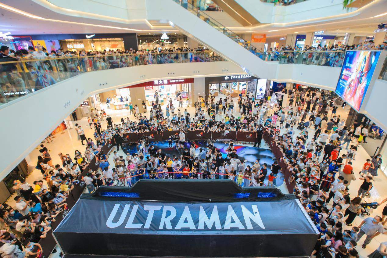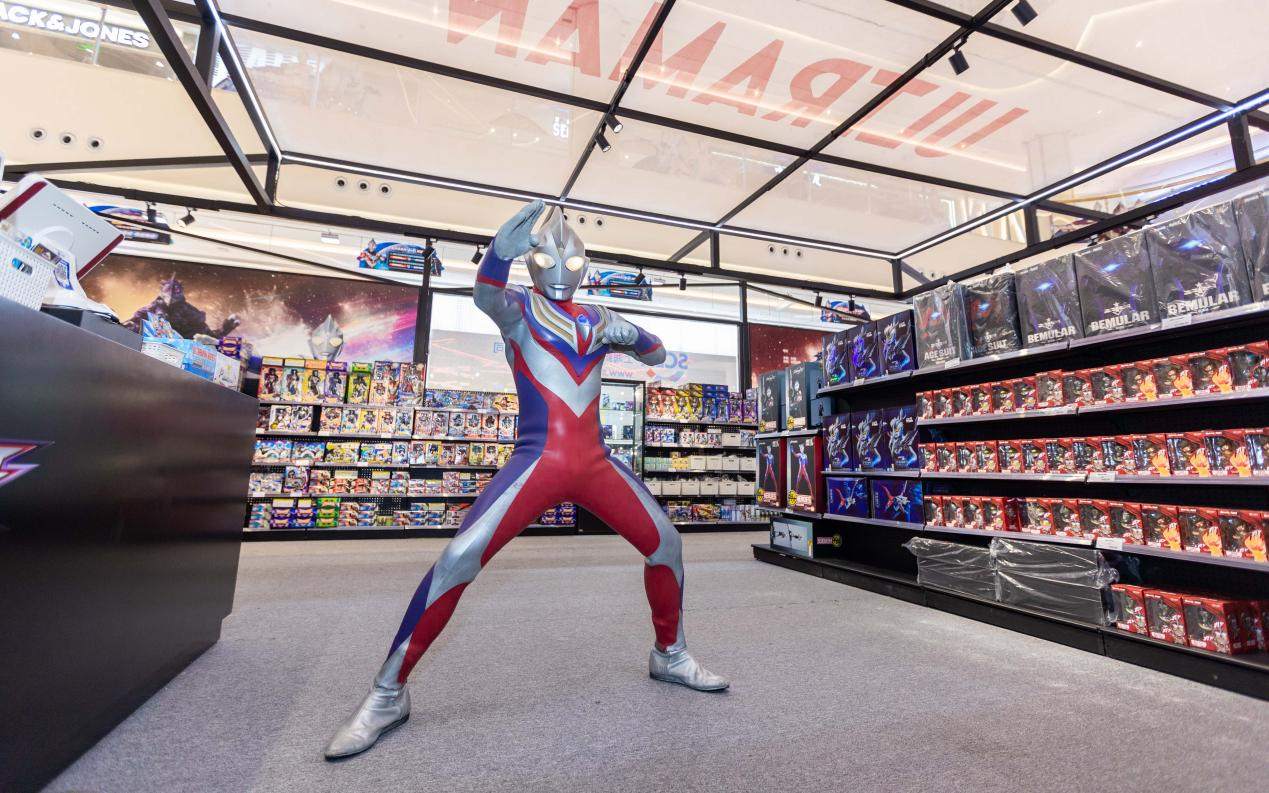 一楼中庭顶空从天而降的迪迦,营造出一种奥特曼迎光而来的感觉,位于中庭的舞台会不定时上演奥特曼对战;这些陈设都让粉丝们一秒重拾记忆。没有对战的时候,舞台上的电子屏会播放奥特曼动画片,延长了粉丝的逗留时间。