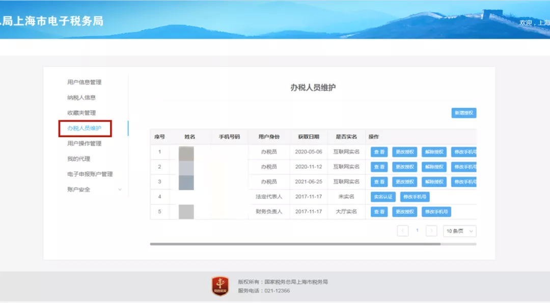 1. 进入电子税务局以后,如需删除办税人员,可在用户管理-办税人员维护界面,在对应的办税人员操作后面,点击【解除授权】,即可删除办税人员。依次点击如下节点办理: