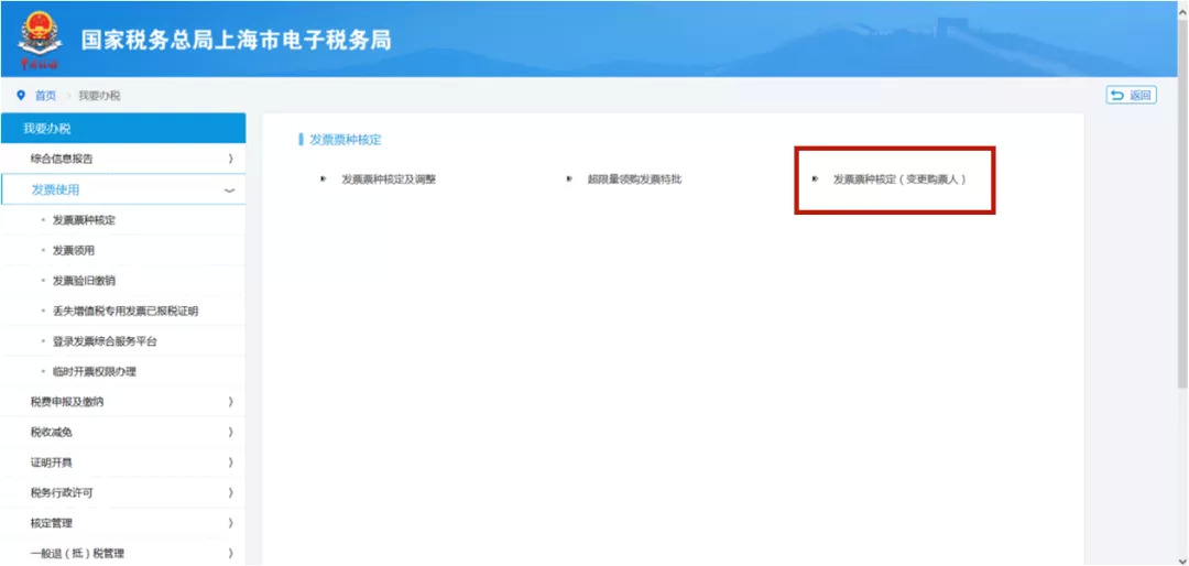 登录电子税务局,点击首页菜单栏中“我要办税”中的“发票使用”菜单,点击“发票票种核定”进入办理页面。