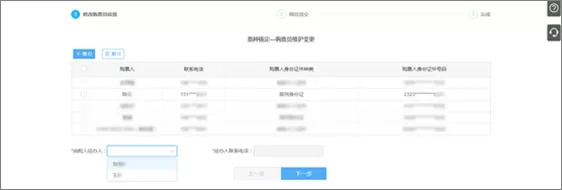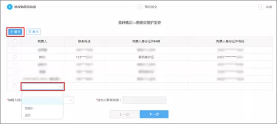 新增领票人:点击增行按钮,然后点击新增行的购票人列,系统将显示已通过实名验证的办税人员。选中行次后,系统自动带出联系电话及身份证件等信息。
