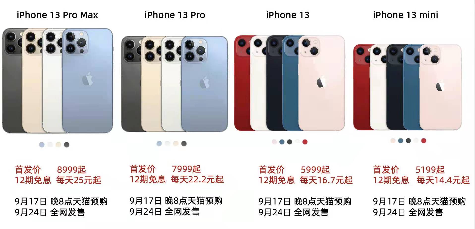 iPhone 13 mini、iPhone 13、iPhone 13 Pro、iPhone 13 Pro Max 的国行起售价分别为5199元、5999元、7999元、8999元。