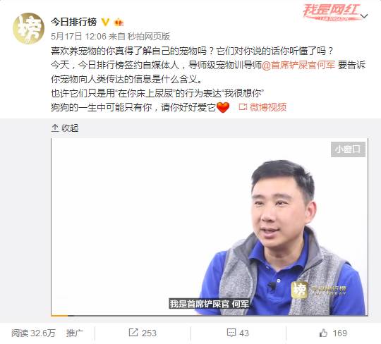 近期在今榜推出的何军老师首期视频中,何军老师生动幽默的分享了狗狗在枕头上尿尿的原因,他戏称自己是“首席铲屎官”。截止5月20日24:00,该条视频获得了32.4万阅读,吸引了众多网友的评论与转发。