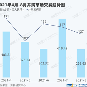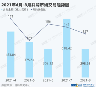 根据清科旗下私募通数据显示,2021年8月中国并购市场共完成127笔并购交易,数量环比下降13.6%,同比下降17.0%。其中披露金额的有110笔,交易总金额约为298.64亿人民币,环比下降51.7%,同比下降42.0%。