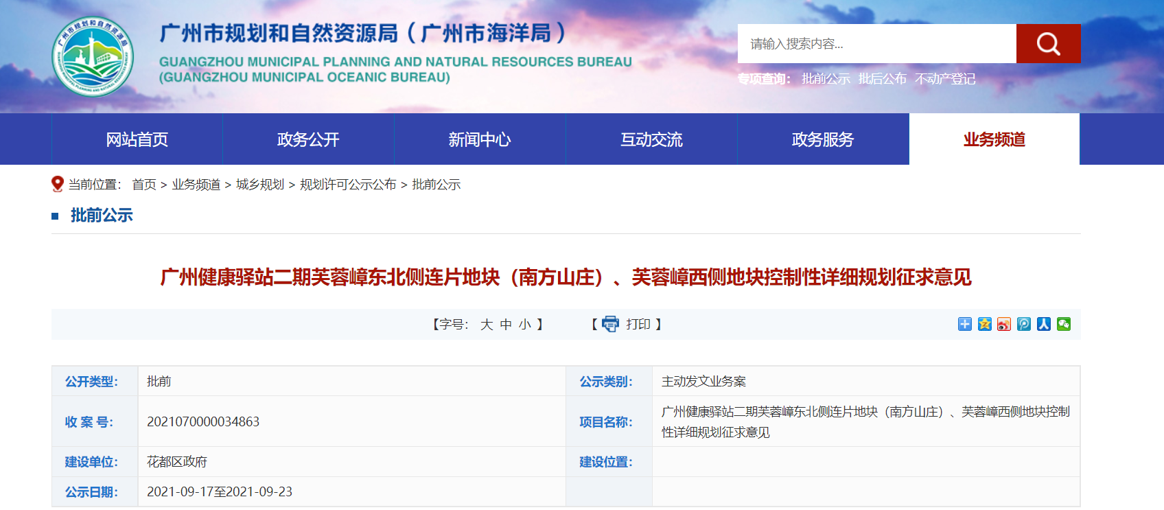 9月17日,广州健康驿站二期芙蓉嶂东北侧连片地块(南方山庄)、芙蓉嶂西侧地块控制性详细规划(方案)在广州市规划和自然资源局官网上公开征求意见。