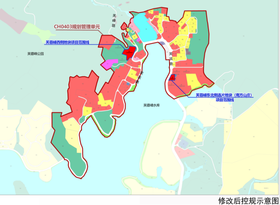 2、芙蓉嶂西侧地块也涉及这两项指标的调整,将CH0403035地块与CH0403038地块进行整合,CH0403035地块用地面积由10295㎡调整为12071㎡。其中,CH0403035地块容积率由0.5调整为1.0,建筑面积由6427.8㎡调整为9306㎡,建筑密度为35%,绿地率为30%,建筑限高为24米。