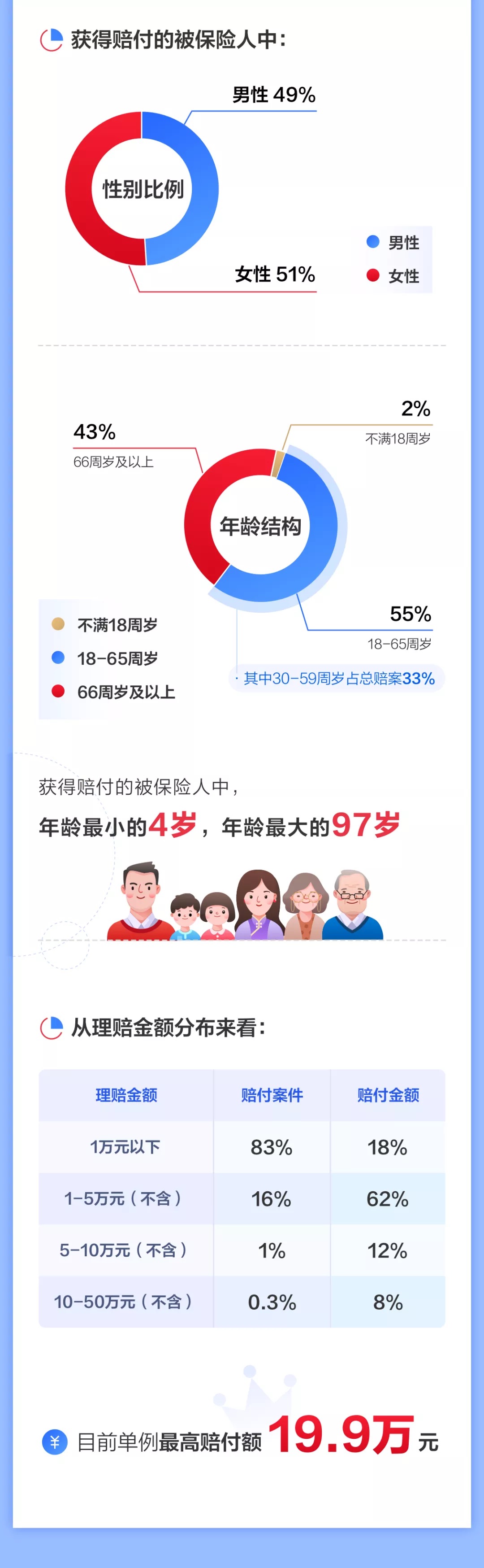 在各年龄段中,18~65岁成为理赔多发人群,占比55%,66岁以上理赔人群占43%,获得赔付的被保险人中,年龄最小4岁,年龄最大的97岁。