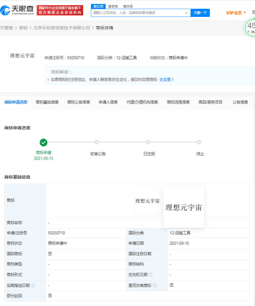 据天眼查APP显示,9月15日,北京车和家信息技术有限公司(理想汽车关联公司)申请注册多个“元宇宙”相关商标,国际分类涉及运输工具、机械设备、燃料油脂等,当前商标状态均为“商标申请中”。