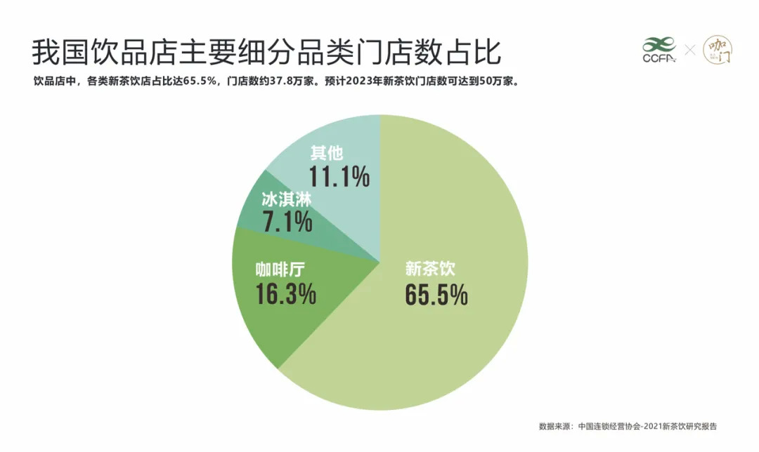 新茶饮店占比65.5%,门店数约37.8万家,预计2023年新茶饮门店数可达到50万家(该数据基于中国连锁经营协会新茶饮委员会对新茶饮门店的定义);